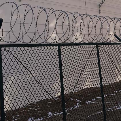 監(jiān)獄監(jiān)管區(qū)隔離網(wǎng) 監(jiān)獄通透式鋼網(wǎng)墻又稱作“Y型安全防御護網(wǎng)”,該產(chǎn)品主要采用高強度鋼絲網(wǎng)片與蛇覆式刀片刺網(wǎng)和防盜連接件組合而