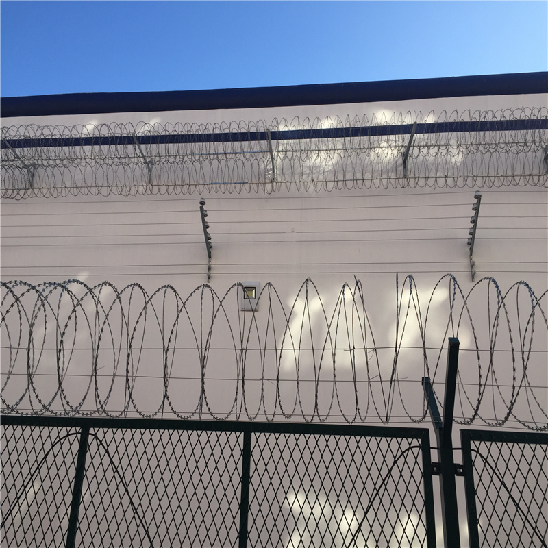 刀片刺繩護(hù)欄網(wǎng)樣式分類:純刺繩橫亙?cè)诹⒅g,這種樣式主要是做軍事防護(hù),另一種是刺繩和網(wǎng)片組合,這種樣式在監(jiān)獄,看守所,