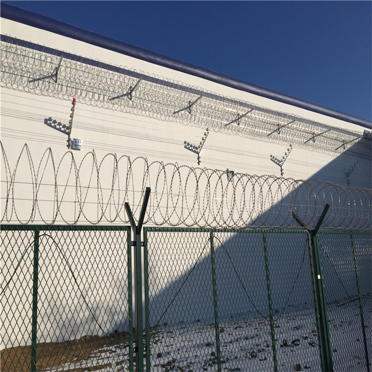 看守所鋼網(wǎng)墻-巡道防護(hù)網(wǎng)上部會(huì)安裝刀片刺網(wǎng)(刺絲滾籠),刀片刺網(wǎng)具有嚇阻、防翻越的效果,材質(zhì)堅(jiān)硬,高強(qiáng)度,高張力,造型設(shè)計(jì)獨(dú)特,不宜觸摸,因而能達(dá)到很好的防護(hù)隔離效果。看守所隔離柵欄-巡道防護(hù)網(wǎng)還具有施工簡(jiǎn)便,經(jīng)濟(jì)實(shí)用等優(yōu)點(diǎn).