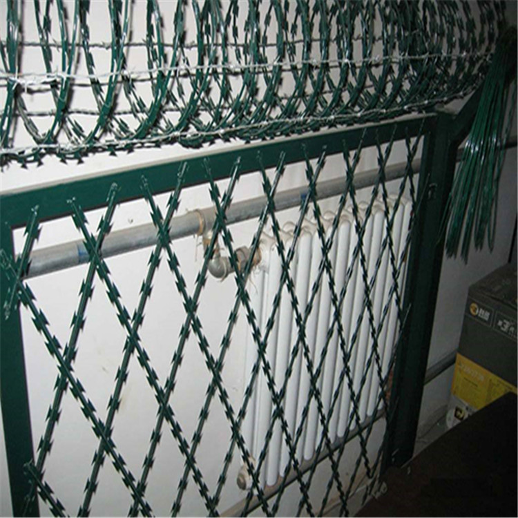 刺繩護(hù)欄網(wǎng)是在兩條刀片刺網(wǎng)之間以不銹鋼片和鍍鋅鋼片強(qiáng)力夾扣,展開后即呈交叉狀,本產(chǎn)品具有防腐、防老化、抗曬、耐候等特點(diǎn)。使用在監(jiān)獄防護(hù)上更起到防攀爬的作用。