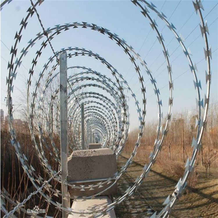 刺繩護(hù)欄網(wǎng)材質(zhì):低碳鋼絲、涂塑絲、噴塑絲、刀片