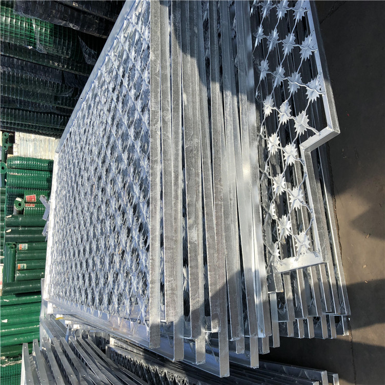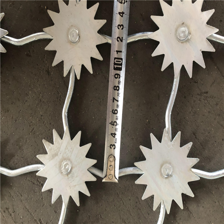 梅花刺防沖隔離網(wǎng)為單層梅花刺片網(wǎng),直徑不小于7.5cm ,刺片厚1.5mm ,采用Q235低碳鋼板沖壓成型。網(wǎng)片為菱形網(wǎng)孔,網(wǎng)格尺