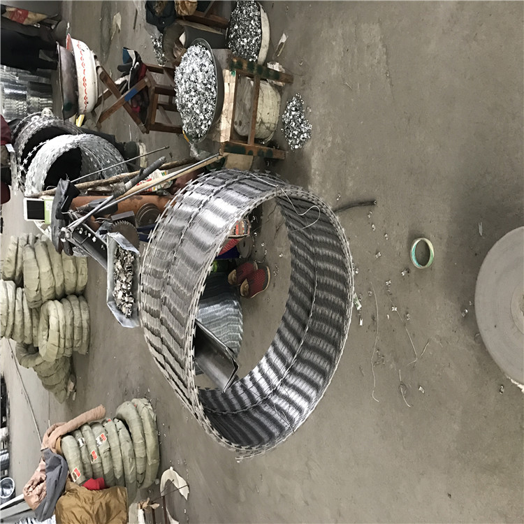 不銹鋼刀片刺繩是一種近年發(fā)展起來的防護(hù)、隔離能力較強(qiáng)的新型防護(hù)網(wǎng)產(chǎn)品。它采用鋼板沖壓成型包附于鋼絲之上,由銳利尖角鍍鋅鋼板或不銹鋼薄板做刀片,高張力鋼絲做芯線組合而成的。常見圈經(jīng)500mm、600mm、800mm,其它規(guī)格也可定制。根據(jù)形狀可分為:螺旋式-刀片刺網(wǎng)、交叉式-刀刺網(wǎng)、平板式-刀片刺網(wǎng)、直線式-刀片刺網(wǎng)。被廣泛應(yīng)用在監(jiān)獄,機(jī)場,軍事基地等高安全場所。