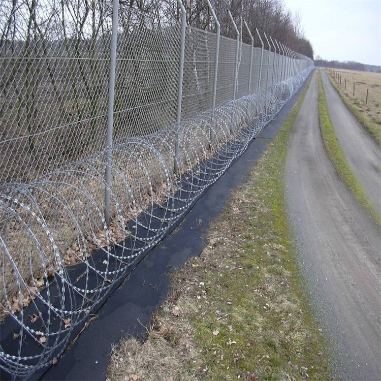3、鍍鋅刺刀圈材料及安裝技術要求:鍍鋅刺刀圈材料:常用刀片刺網(wǎng)規(guī)格為BTO-22,刺圈直徑500mm,刀片長度22mm,刀片寬度15mm,刀片間距34mm,鍍鋅噴塑。鍍鋅刺刀圈規(guī)格為雙股2mm鐵絲捻扎而成,刺結(jié)間距102mm,鍍鋅防腐。鍍鋅刺刀圈安裝應控制在每米圍界范圍內(nèi)有5個刺圈,即刺圈安裝間距20Omm,要求刀刺圈間距均勻,上下口平直。刺刀圈固定件為專用卡扣,使用專用工具固定在鋼圍界刺繩上,卡扣不得有松動現(xiàn)象,保證刺網(wǎng)安裝牢固。