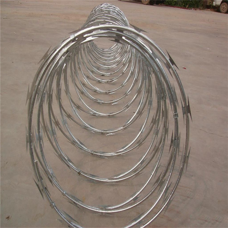 刀片剌網是一種近年起來的防護,隔離能力比較強的防護產品,采用優(yōu)質鋼片沖壓尖刺包裹高強度鋼絲壓制而成,雙線用卡扣銜接固定,呈現(xiàn)螺旋型 ,即美觀又讓人不寒而栗,起來了很好的阻嚇作用。-般監(jiān)獄用不銹鋼304的比較多,看守所有用不銹鋼304的,這樣不銹鋼的成本高,使用時間就長,普通熱鍍鋅+的上鋅量也就30-40克,機場和高鐵用的一般的就是高熱鍍鋅的,上鋅量在120克左右,這種成本低,壽命短。