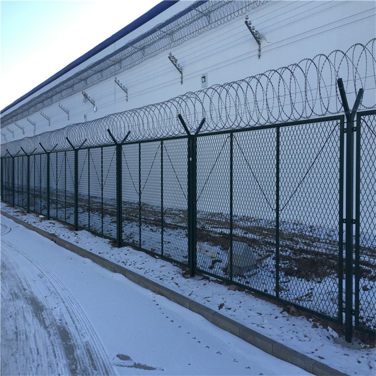 監(jiān)獄鋼網(wǎng)墻是一種新型防護網(wǎng),這種新型刀刺護欄網(wǎng)由蛇腹式刀刺網(wǎng)和焊接刀片刺網(wǎng)網(wǎng)片或有鋼絲焊接的網(wǎng)片組成。監(jiān)獄隔離網(wǎng)可平地安裝,也可在圍墻上二次安裝,有效防止攀逃。直刺式刺網(wǎng)隔離帶,是用柱體和普通刺繩橫、縱、斜向交叉綁定成刺網(wǎng)隔離帶。主要用于特殊地帶、軍事基地圈護、溝壕圈護,安裝簡易,經(jīng)濟耐用。 監(jiān)獄護欄網(wǎng)又稱作“Y型安全防御護網(wǎng)”,是由V型支架立柱,加強型焊接片網(wǎng),安全防盜連接件和熱鍍鋅刀片刺籠組成,強度和安全防御性級別很高。近年來,被廣泛應(yīng)用在監(jiān)獄,軍事基地等高安全場所。注:如果在監(jiān)獄護欄網(wǎng)頂部加裝刀片刺絲、刀片刺繩后又很好的增強了安全防護性能。采用電鍍、熱鍍、噴塑、浸塑等防腐形式,具有很好的抗老化、抗曬、耐候等特點。其產(chǎn)品造型美觀、花色多樣,既起到圍欄作用,又起到美化作用。由于具有安全性高、防攀爬能力好,網(wǎng)片連接方式采用特制SBS緊扣件,有效防止人為的破壞性拆卸,橫向四道折彎加強筋,使網(wǎng)面強度顯著增加。