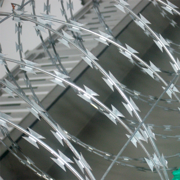 獄墻鋼網(wǎng)墻-通道隔離網(wǎng)的刀片刺網(wǎng)主要是由熱鍍鋅鋼板或不銹鋼薄板沖壓而成的,它擁有尖銳的刀片,高張力鍍鋅鋼絲或者不銹鋼絲做芯線組合而成的產(chǎn)品。由于刺網(wǎng)的形狀很特別,而且每個(gè)角度都有尖狀刀片,因而能達(dá)到極好的防御保護(hù)效果。