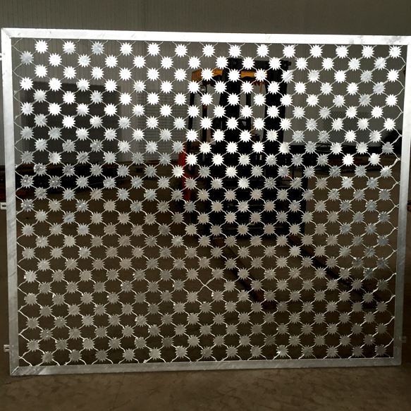 梅花刺隔離網(wǎng)為單層梅花刺片網(wǎng),直徑不小于7.5cm,刺片厚1.5mm,采用Q235低碳鋼板沖壓成型。網(wǎng)片為菱形網(wǎng)孔,網(wǎng)格尺寸:120mm*110mm,網(wǎng)絲直徑8mm,采用S195線材高壓焊接,每一個(gè)焊點(diǎn)附焊梅花刺一個(gè)。