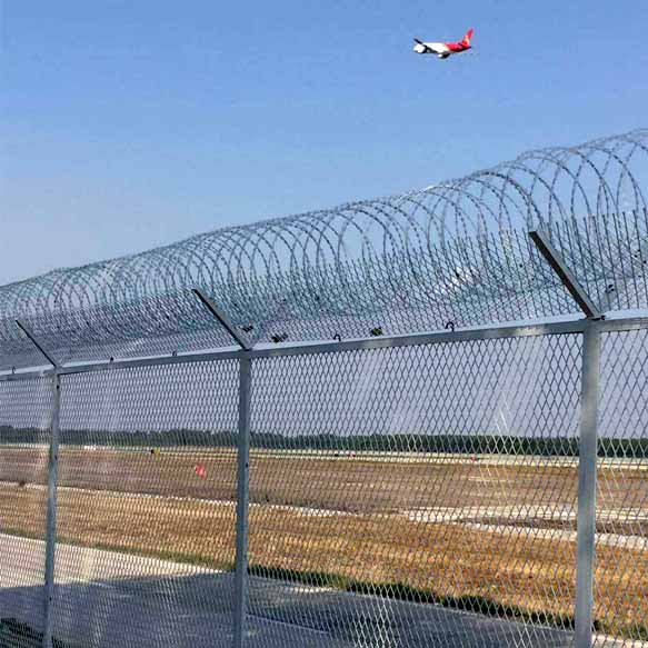 種新型防護(hù)網(wǎng),由銳利尖角鍍鋅鋼板或不銹鋼薄板做刀片,鋼絲做芯線組合而成的防護(hù)器材.機(jī)場圍網(wǎng)網(wǎng)格結(jié)構(gòu)簡練、便于運(yùn)輸、安裝不受地形
