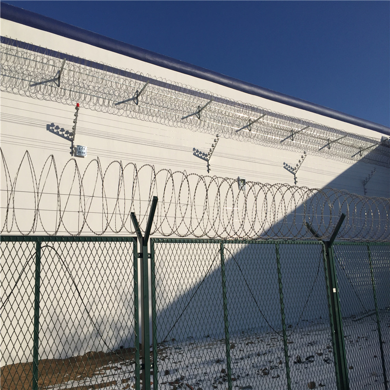 絲焊接而成的網(wǎng)片、立柱、刺鐵絲、連接而成,產(chǎn)品具有美觀、大方、防腐、防攀爬的能力。主要適用于監(jiān)獄,機(jī)場,軍事基地,企業(yè)周圍